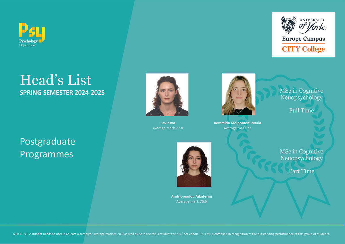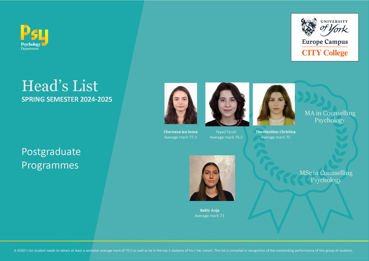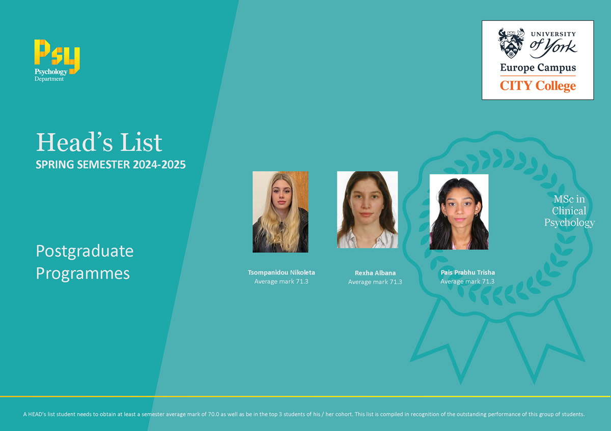 A HEAD's list student needs to obtain at least a semester average mark of 70.0 as well as be in the top 3 students of his / her cohort. This list is compiled in recognition of the outstanding performance of this group of students.