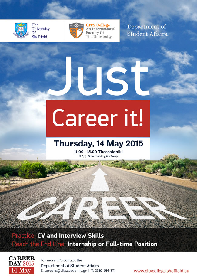 Με ιδιαίτερη επιτυχία και μεγάλη προσέλευση πραγματοποιήθηκε και φέτος η Ημέρα Καριέρας (Career Day) του CITY College, Διεθνούς Τμήματος του Πανεπιστημίου του Sheffield, με θέμα ‘Just Career it!’, στις εγκαταστάσεις της υπερσύγχρονης βιβλιοθήκης του Κολεγίου, του Information and Learning Commons (ILC), στο κέντρο της Θεσσαλονίκης στις 14 Μαΐου 2015.